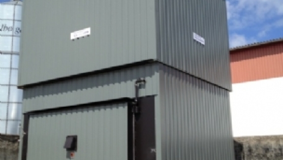 Beskrivelse: Udskiftning af oliefyr. Fyret er udført i merlingrå plader, med grålig farvet tag.